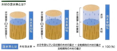 乾燥した材木と同じ重さの水分を含んでいると「含水率・100%」となります。