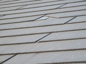 と聞いての調査でしたが、屋根を確認するとスレートの一部がヒビや割れを発見。